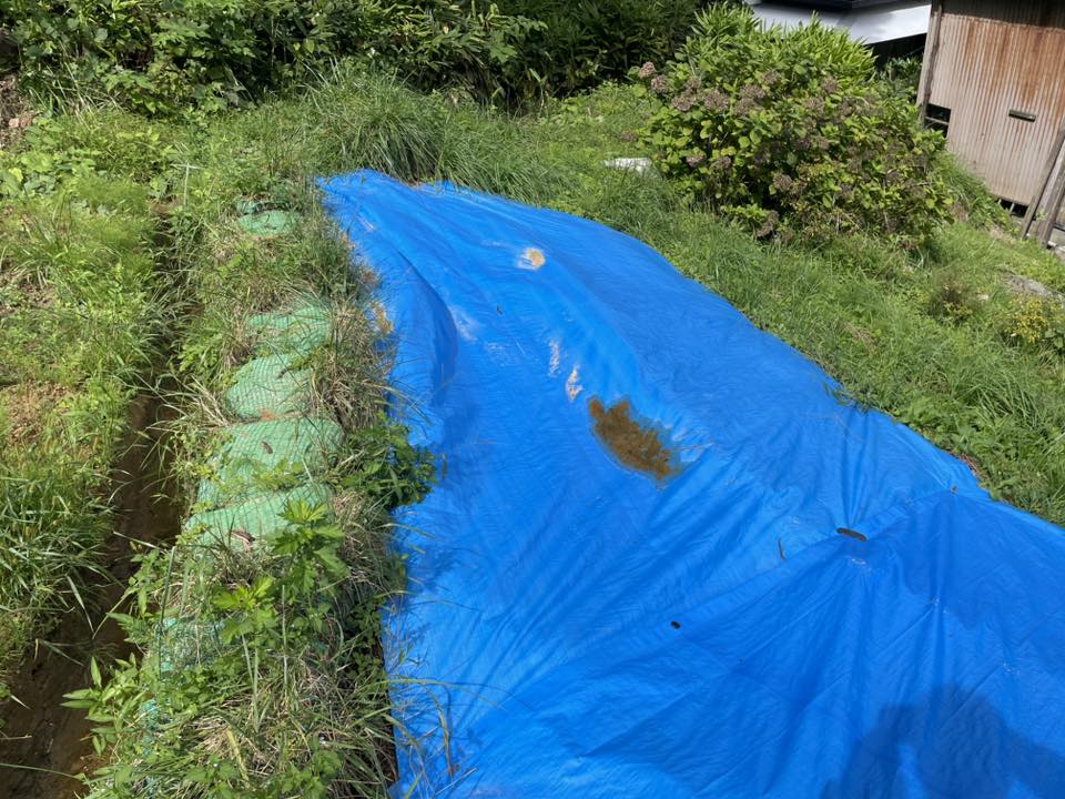 ・裏山土留め工より下の中腹部分が崩れ、横に大きな亀裂が入り、ブルーシートで応急対応していること確認