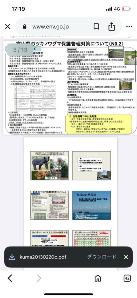 ・だが、そもそもの生息域である奥山で木の実が不足して人間の生活エリアに出てきていることから、木の実がなる木の植林をする対策をすべきと考えるが行政からはそうした声は聞こえてこない。