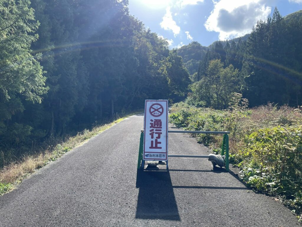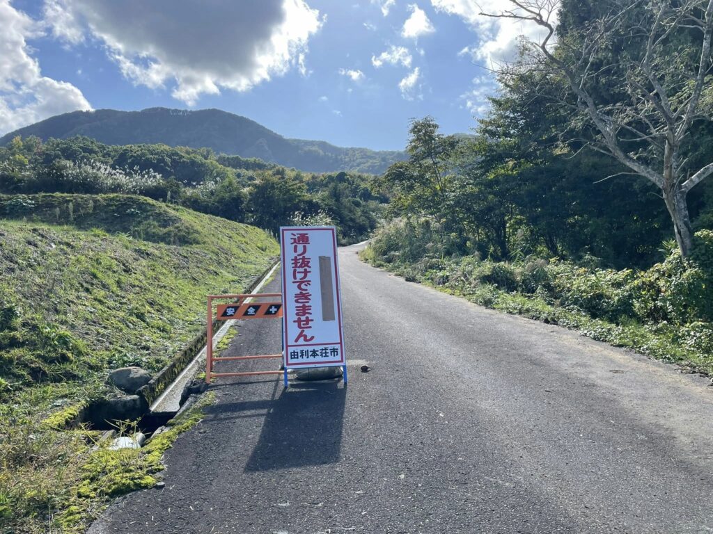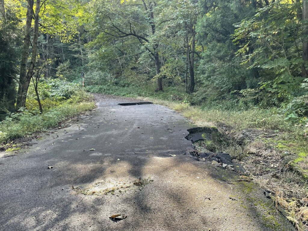 ・昨年災害で被災した市道八塩線。まだ穴が空いたままで危険。被災箇所多いのは分かるが、観光として位置づけている八塩登山口への道。通行止めし、迂回路あるが、いつ復旧するのか、応急対応できるはず。