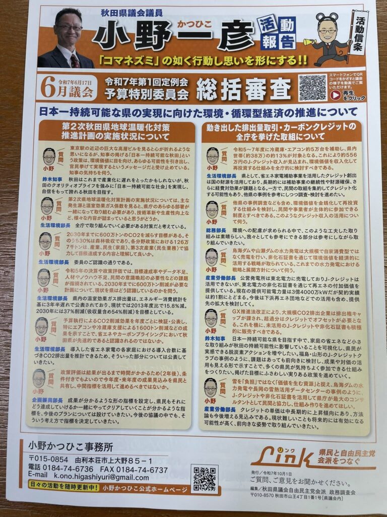 県民の声を聴く活動及び活動報告(6月議会で脱炭素関連で小野一彦が総括審査質問)